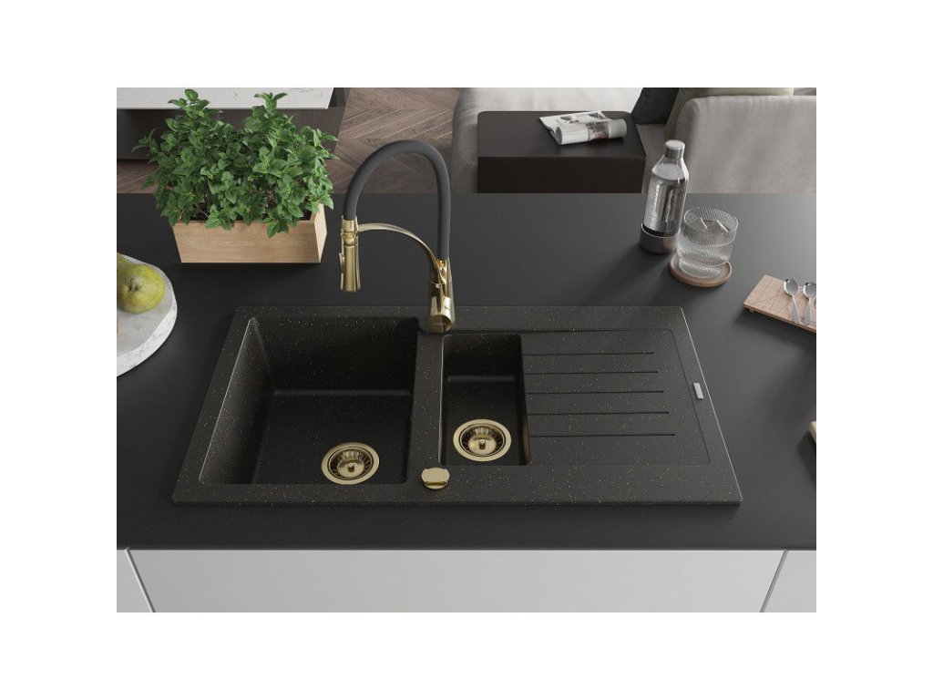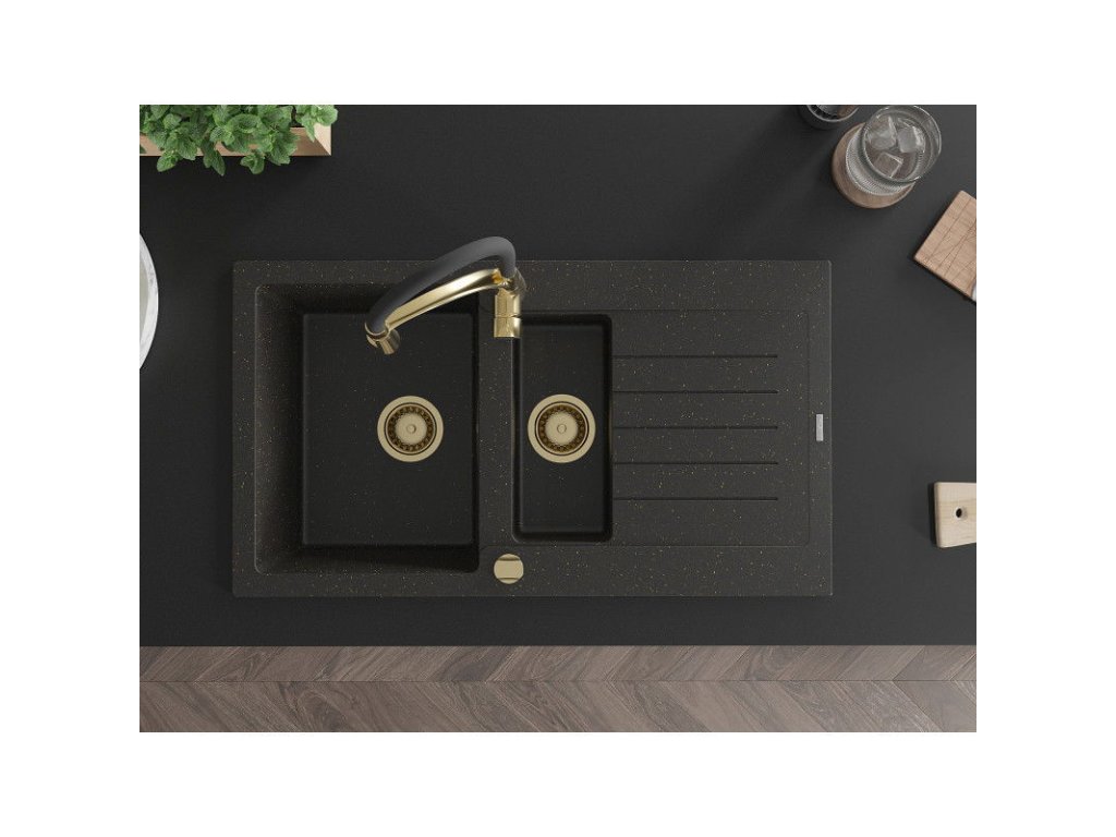 Granitový drez Mexen Matias s 1,5 misky, odkapávačom a batériou Aster, čierna/zlatá metalíza - 6502-75-73450-57-G