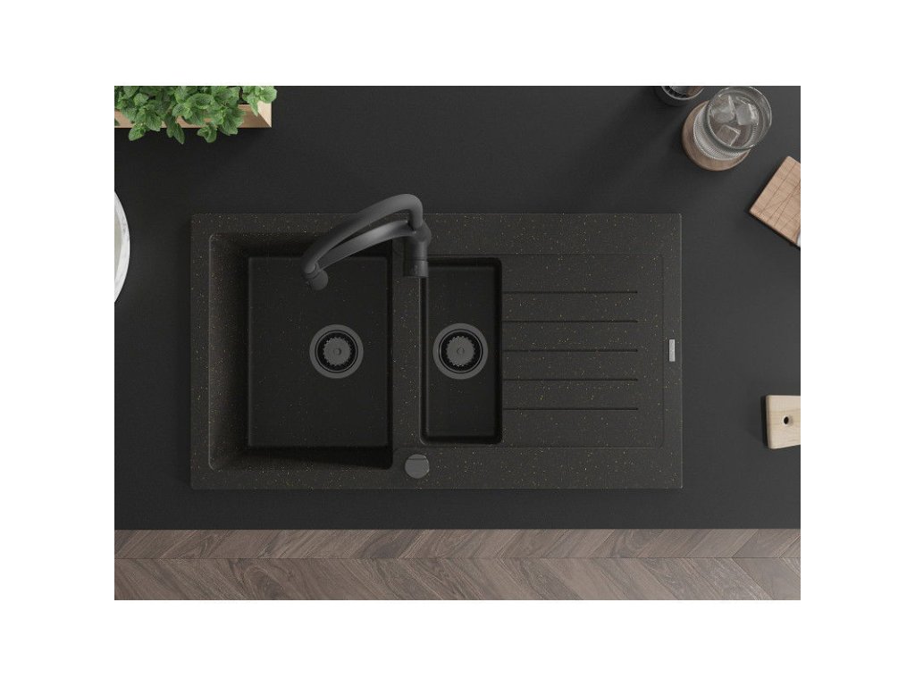 Granitový drez Mexen Matias s 1,5 misky, odkapávačom a batériou Aster, čierna/zlatá metalíza - 6502-75-73450-70-B
