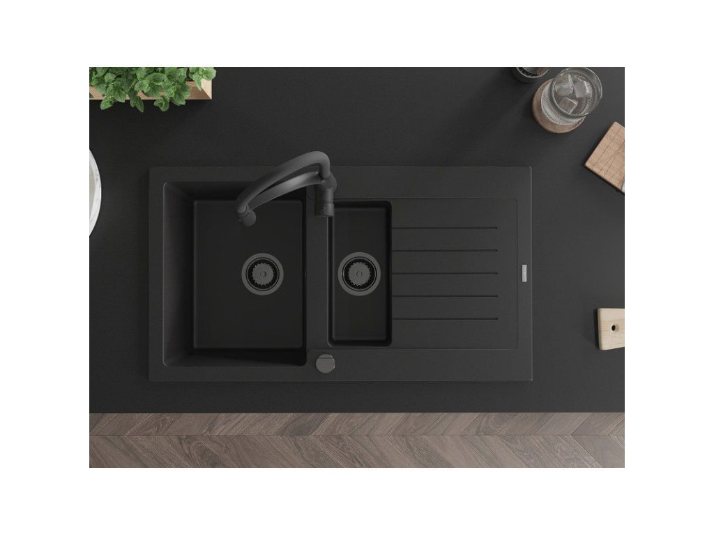 Granitový drez Mexen Matias s 1,5 misky, odkapávačom a kuchynskou batériou Aster, čierny - 6502-77-73450-70-B