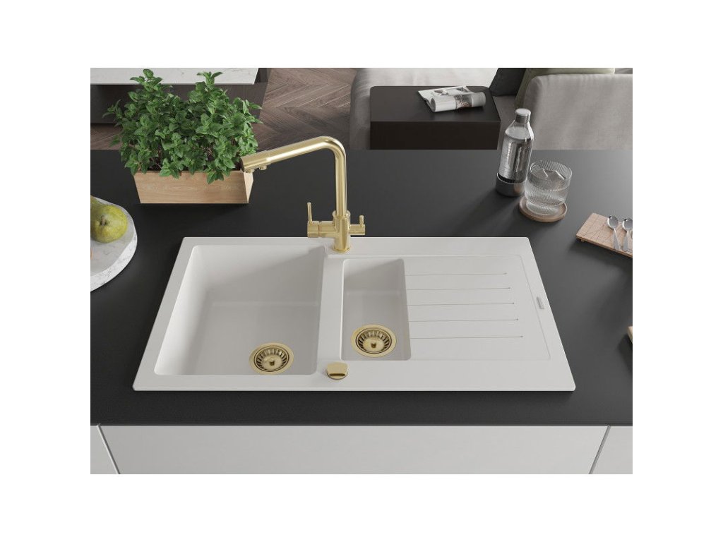 Granitový drez Mexen Matias s 1,5 misky, odkapávačom a kuchynskou batériou Duero, biely - 6502-20-671600-50