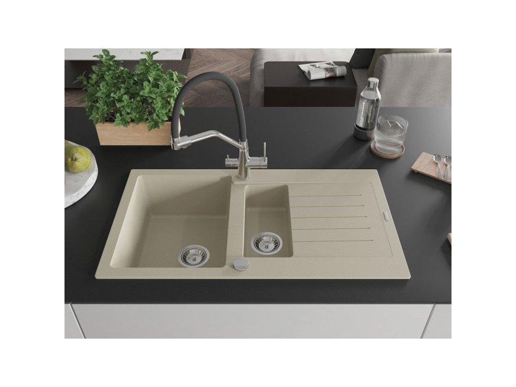Granitový drez Mexen Matias s 1,5 misky, odkapávačom a kuchynskou batériou Duo, béžový - 6502-69-671701-07
