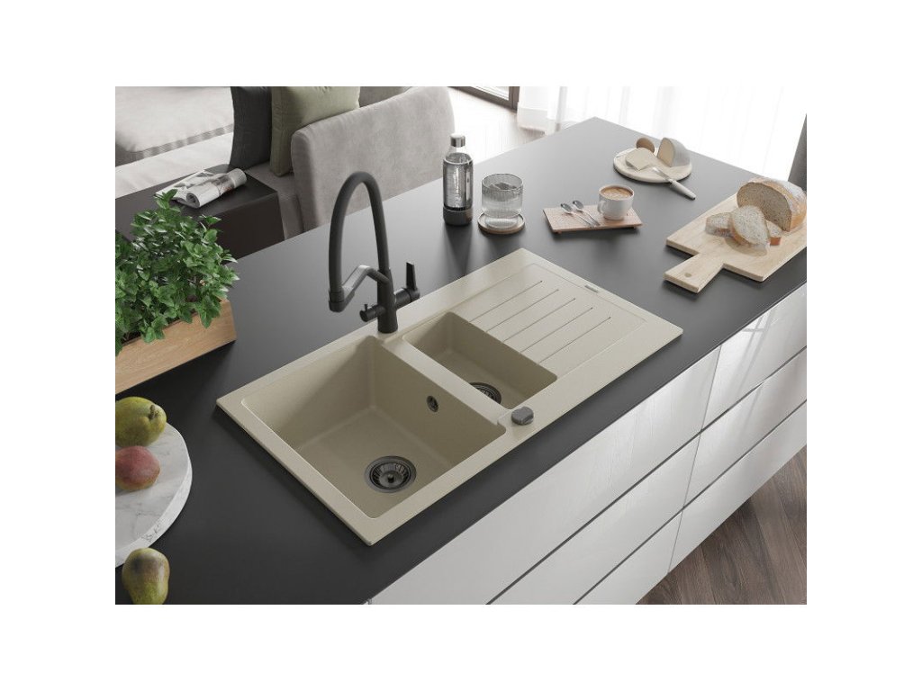 Granitový drez Mexen Matias s 1,5 misky, odkapávačom a kuchynskou batériou Duo, béžový - 6502-69-671701-70-B