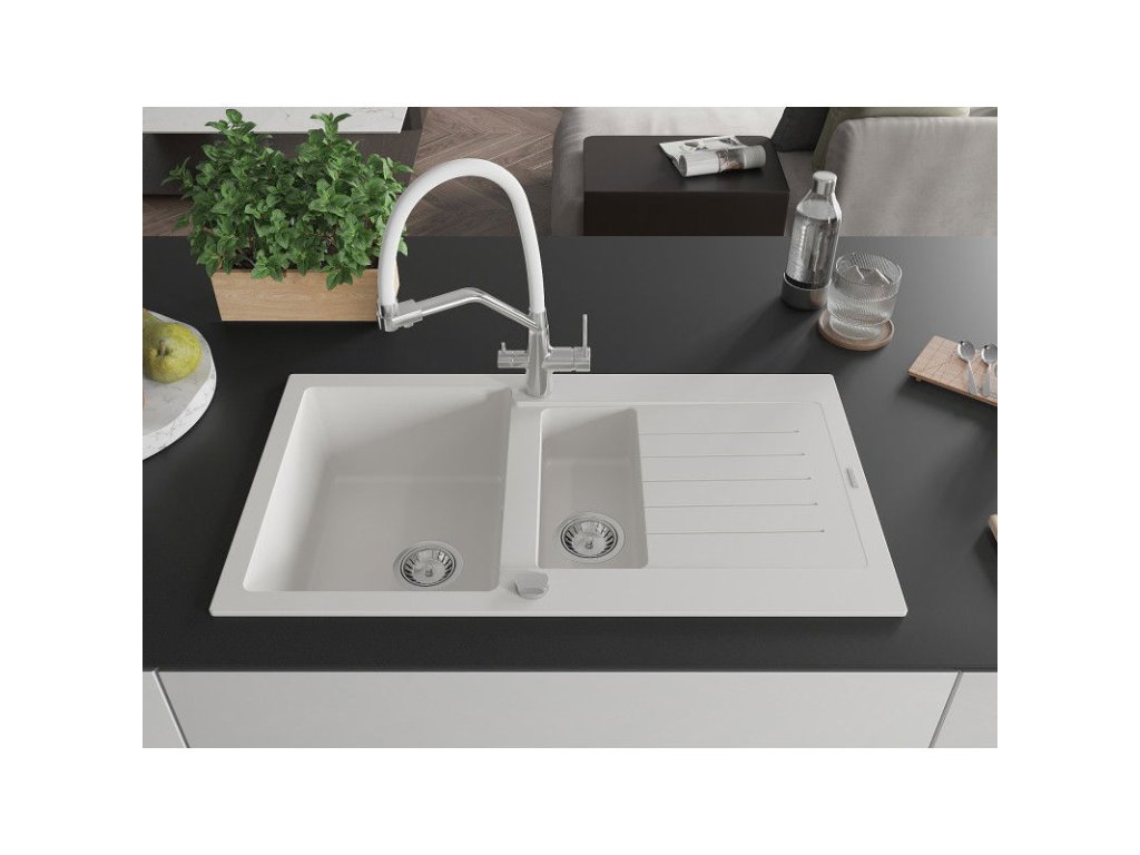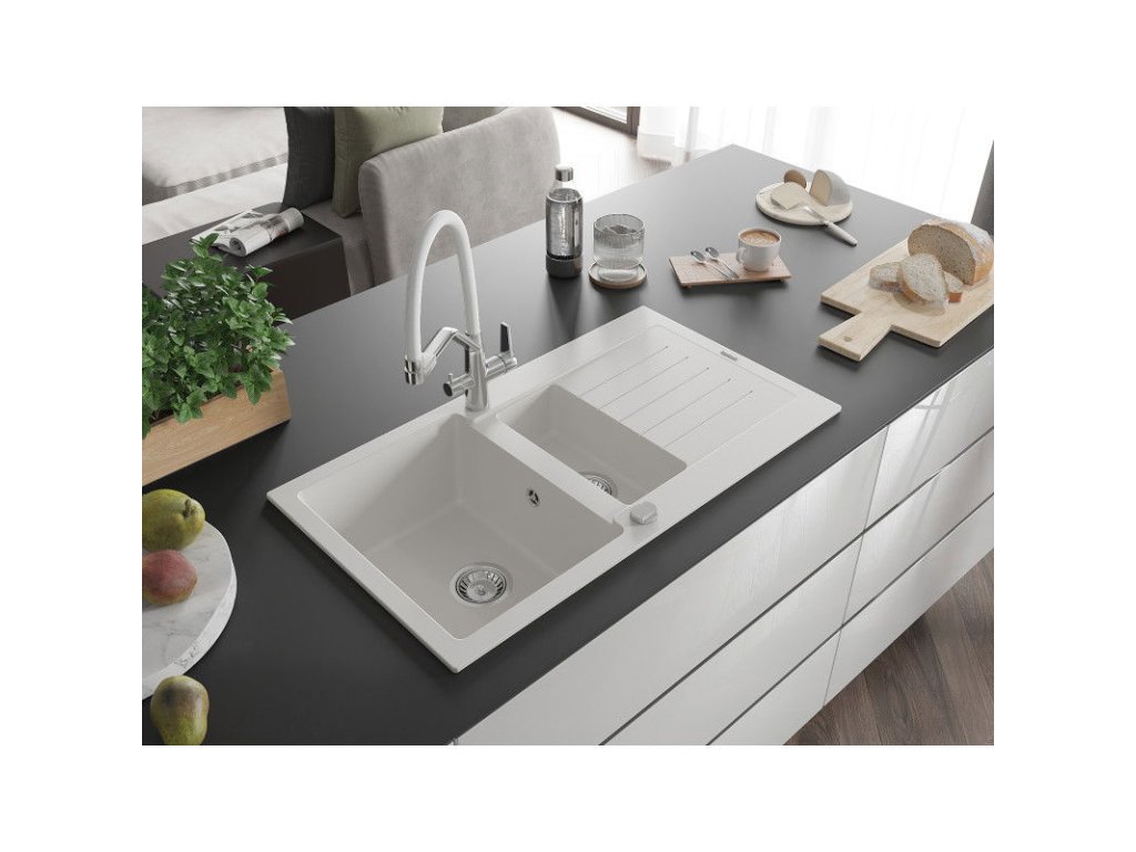 Granitový drez Mexen Matias s 1,5 misky, odkapávačom a kuchynskou batériou Duo, biely - 6502-20-671701-02