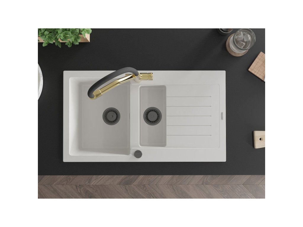 Granitový drez Mexen Matias s 1,5 misky, odkapávačom a kuchynskou batériou Duo, biely - 6502-20-671701-57-B