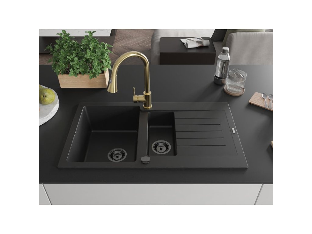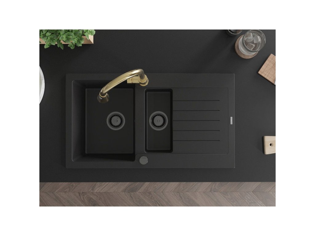 Granitový drez Mexen Matias s 1,5 misky, odkapávačom a kuchynskou batériou Elia, čierny - 6502-77-670101-50-B