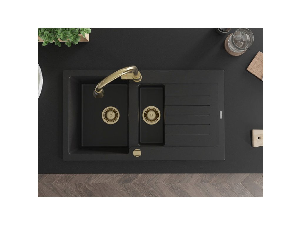 Granitový drez Mexen Matias s 1,5 misky, odkapávačom a kuchynskou batériou Elia, čierny - 6502-77-670101-50