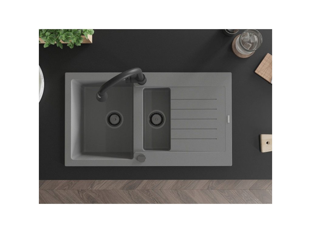Granitový drez Mexen Matias s 1,5 misky, odkapávačom a kuchynskou batériou Elia, sivý - 6502-71-670101-70-B