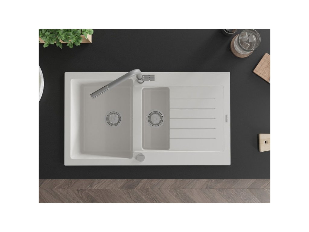 Granitový drez Mexen Matias s 1,5 misky, odkapávačom a kuchynskou batériou Flora, biely - 6502-20-670401-06
