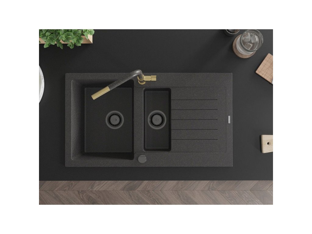 Granitový drez Mexen Matias s 1,5 misky, odkapávačom a kuchynskou batériou Flora, čierna škvrnitá - 6502-76-670401-75-B