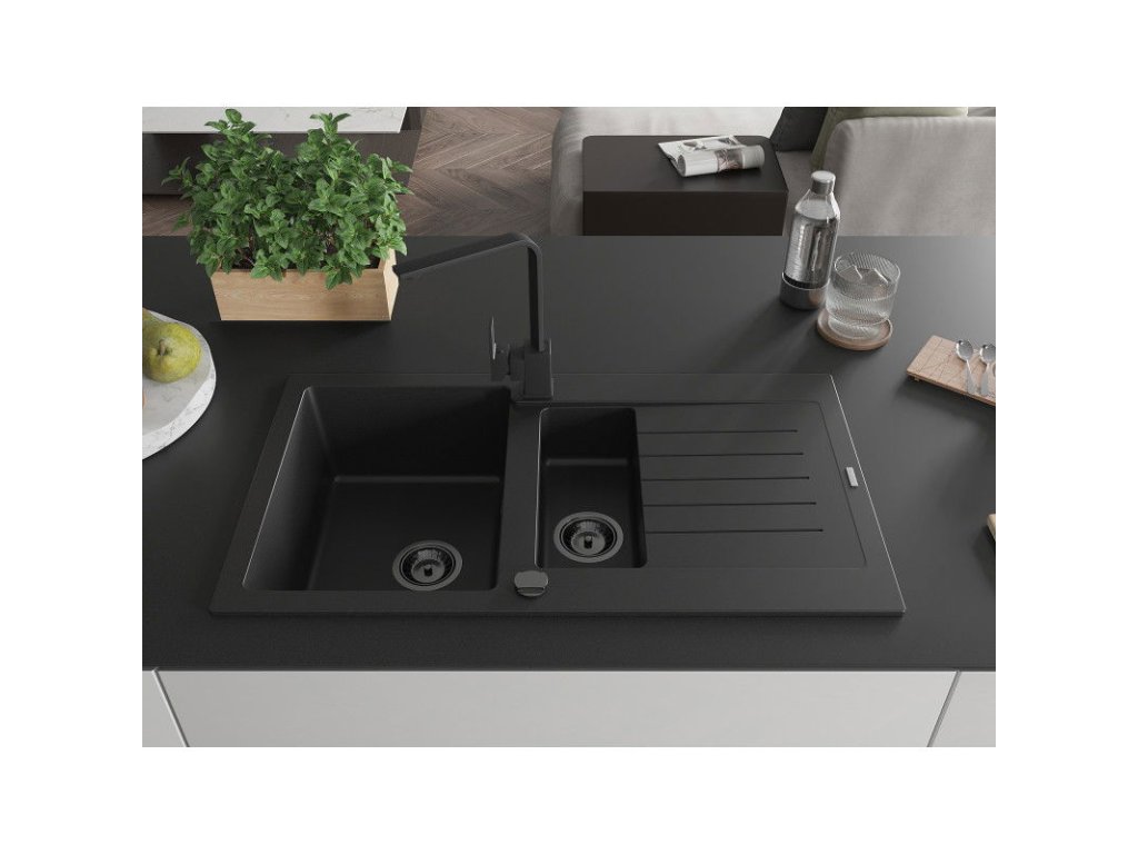 Granitový drez Mexen Matias s 1,5 misky, odkapávačom a kuchynskou batériou Rita, čierny - 6502-77-670300-70-B