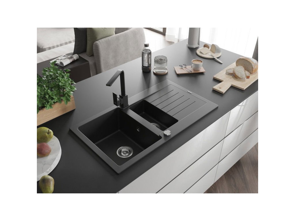 Granitový drez Mexen Matias s 1,5 misky, odkapávačom a kuchynskou batériou Rita, čierny - 6502-77-670300-70