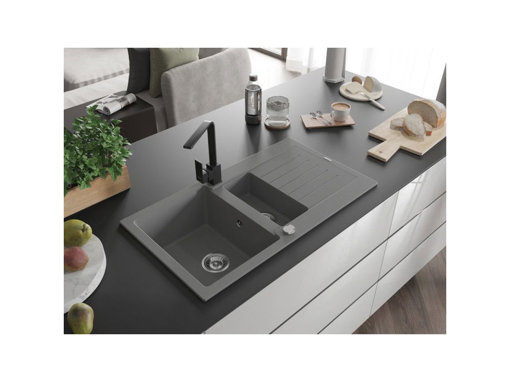 Granitový drez Mexen Matias s 1,5 misky, odkapávačom a kuchynskou batériou Rita, sivý - 6502-71-670300-70