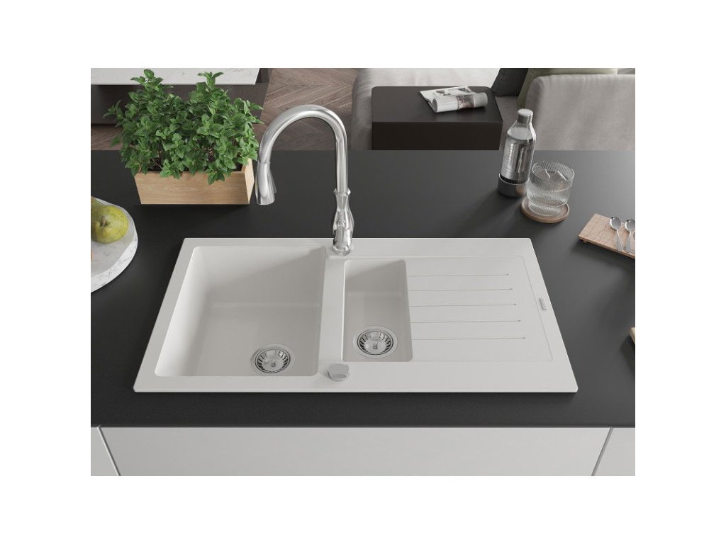 Granitový drez Mexen Matias s 1,5 misky, odkapávačom a kuchynskou batériou Savita, biely - 6502-20-672601-00