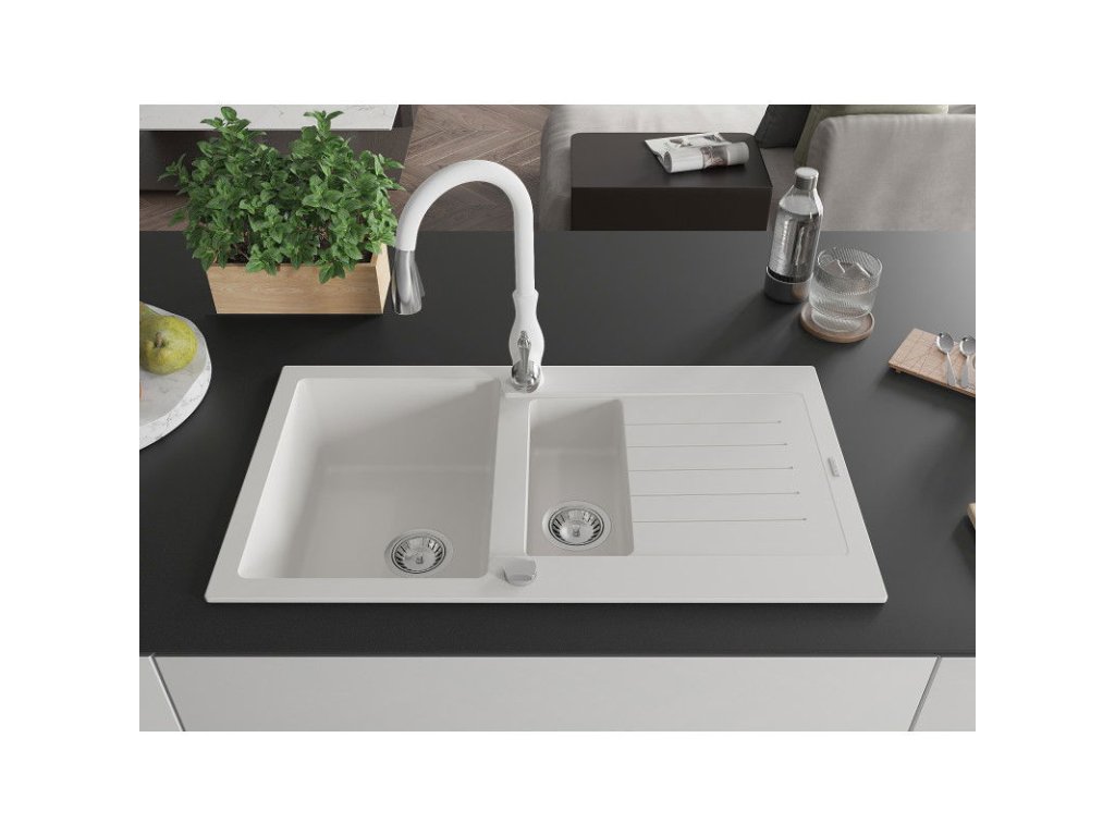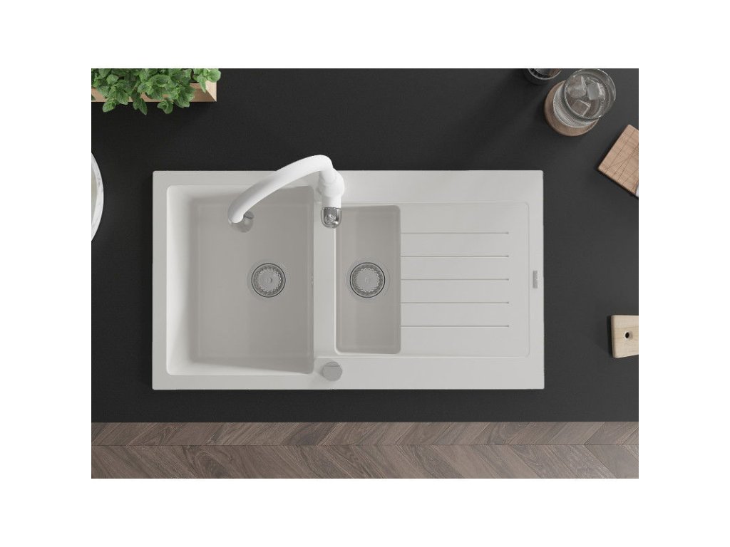 Granitový drez Mexen Matias s 1,5 misky, odkapávačom a kuchynskou batériou Savita, biely - 6502-20-672601-20