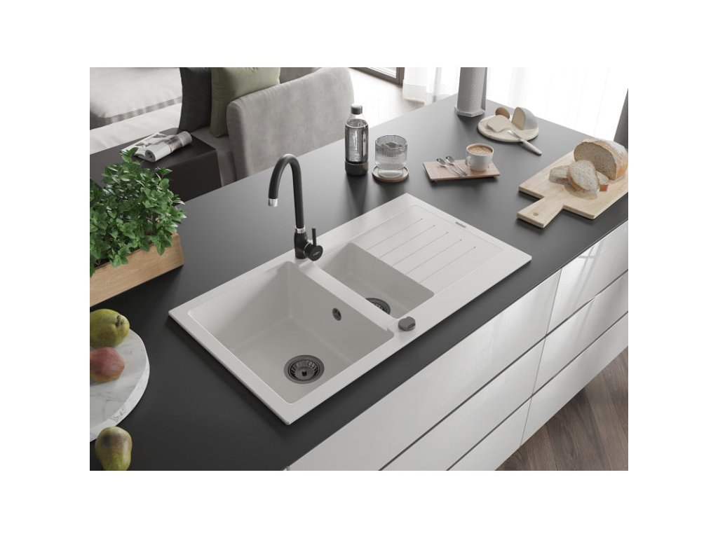 Granitový drez Mexen Matias s 1,5 misky, odkapávačom a kuchynskou batériou Telma, biely - 6502-20-670200-70
