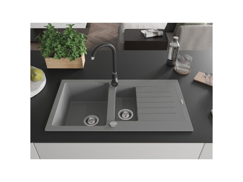 Granitový drez Mexen Matias s 1,5 misky, odkapávačom a kuchynskou batériou Telma, sivý - 6502-71-670200-70