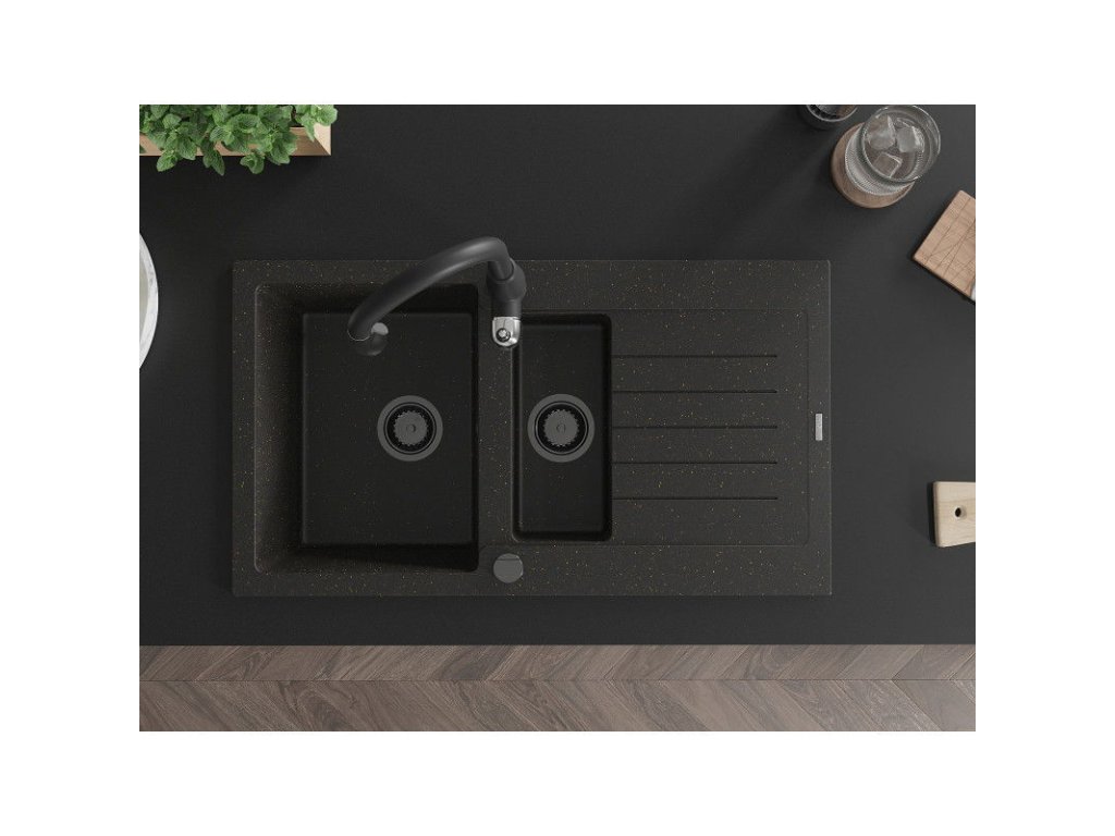 Granitový drez Mexen Matias s 1,5 misy, odkapávačom a batériou Savita, čierna/zlatá - 6502-75-672601-70-B