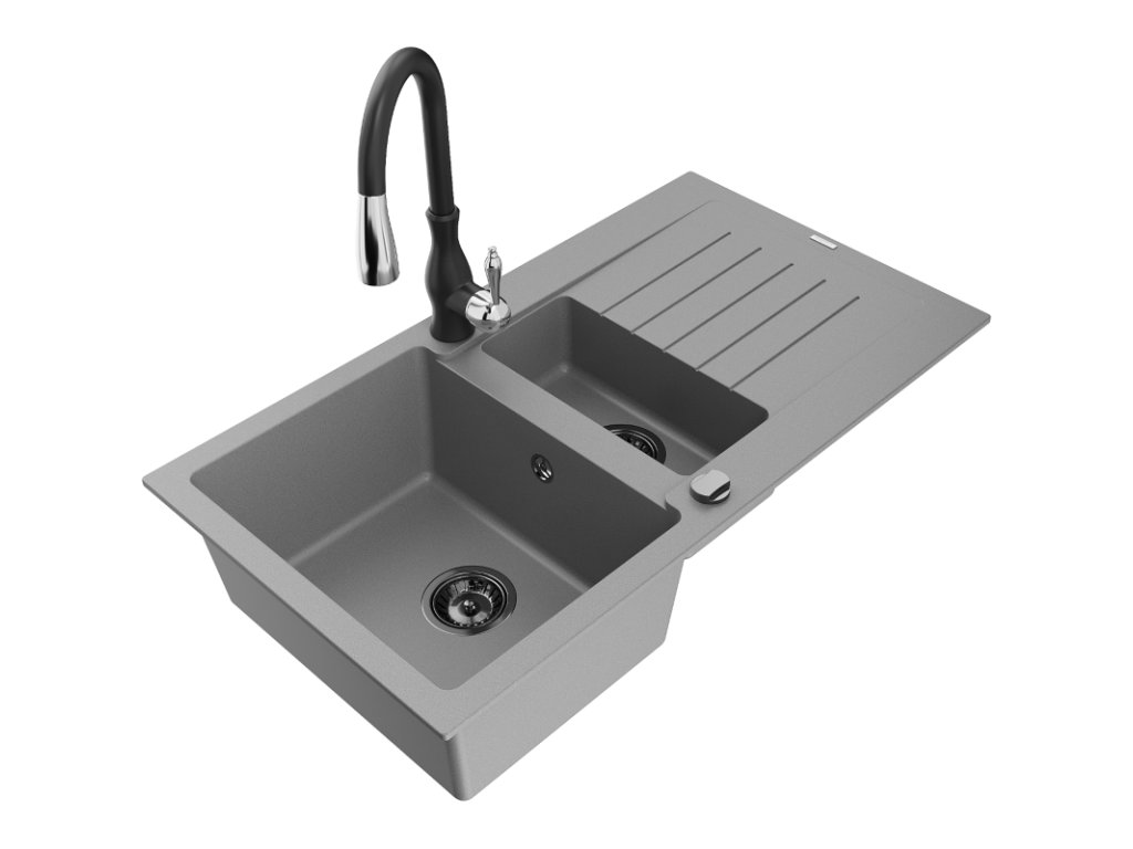 Granitový drez Mexen Matias s 1,5 misy, odkapávačom a batériou Savita, sivý - 6502-71-672601-70-B