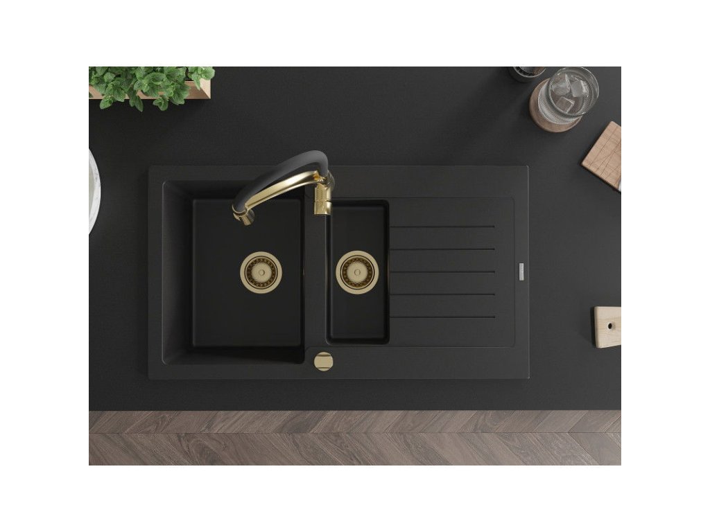Granitový drez Mexen Matias s 1,5 misy, odkapávačom a kuchynskou batériou Aster, čierny - 6502-77-73450-57-G