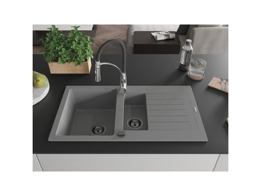 Granitový drez Mexen Matias s 1,5 misy, odkapávačom a kuchynskou batériou Aster, sivý - 6502-71-73450-07-B