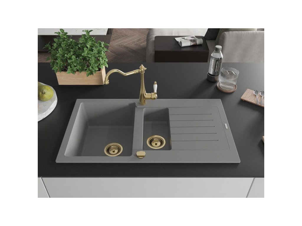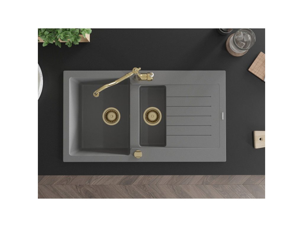 Granitový drez Mexen Matias s 1,5 misy, odkapávačom a kuchynskou batériou Carla, sivý - 6502-71-670700-50
