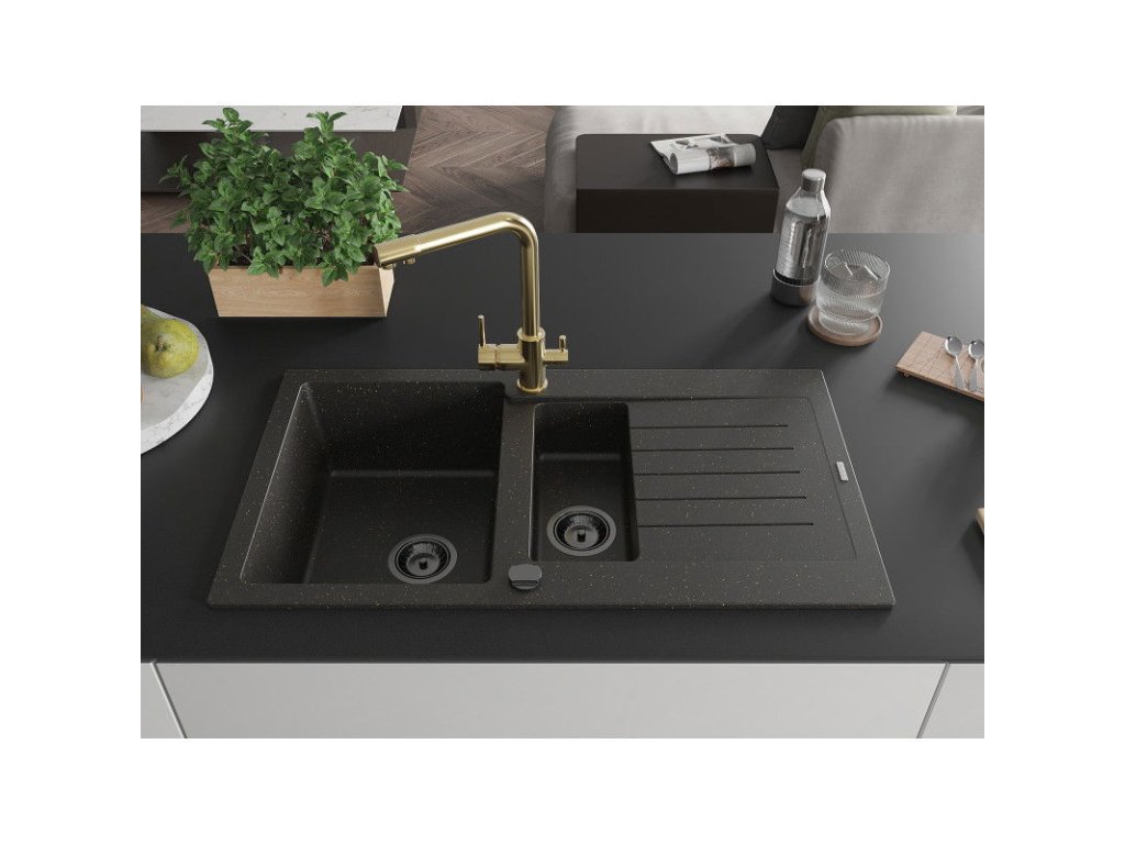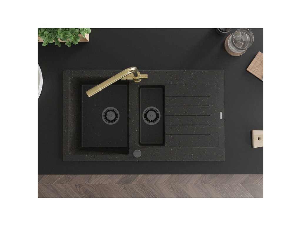 Granitový drez Mexen Matias s 1,5 misy, odkapávačom a kuchynskou batériou Duero, čierna/zlatá - 6502-75-671600-50-B
