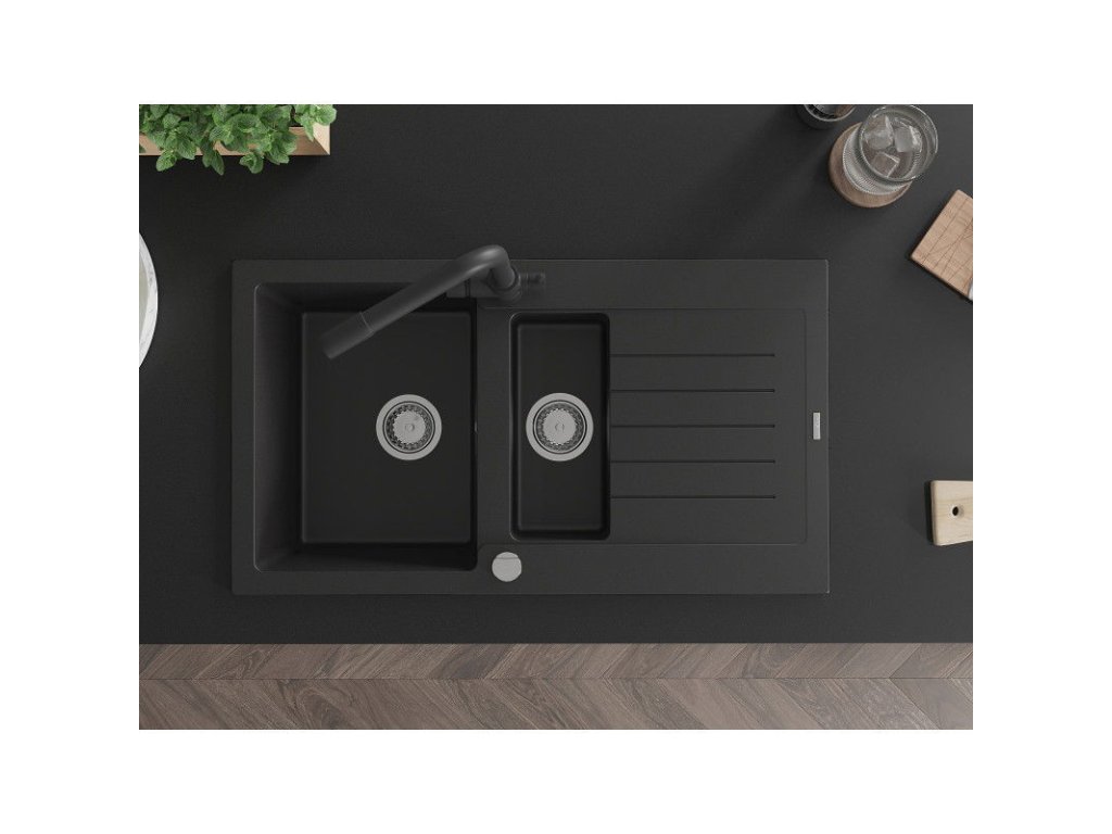 Granitový drez Mexen Matias s 1,5 misy, odkapávačom a kuchynskou batériou Duero, čierny - 6502-77-671600-70