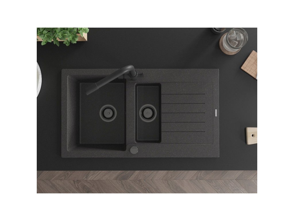 Granitový drez Mexen Matias s 1,5 misy, odkapávačom a kuchynskou batériou Duero, čierny bodkovaný - 6502-76-671600-70-B