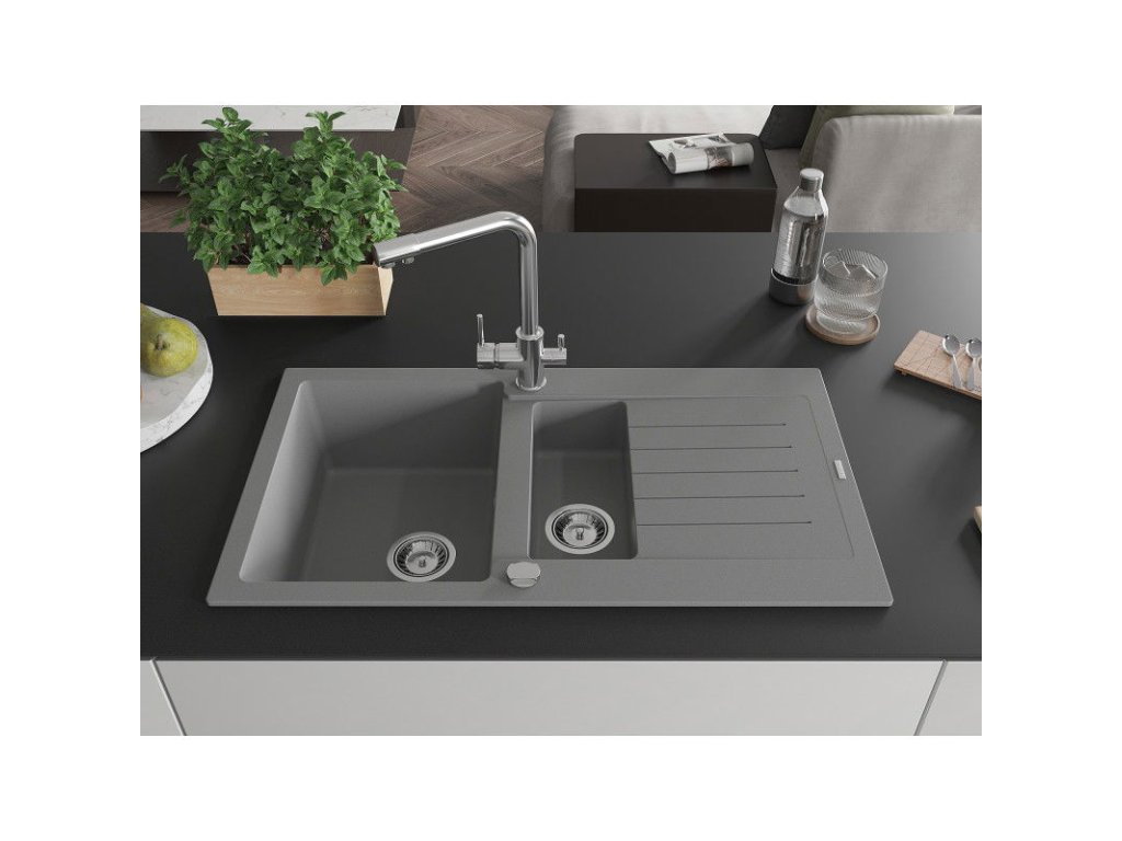 Granitový drez Mexen Matias s 1,5 misy, odkapávačom a kuchynskou batériou Duero, sivý - 6502-71-671600-00
