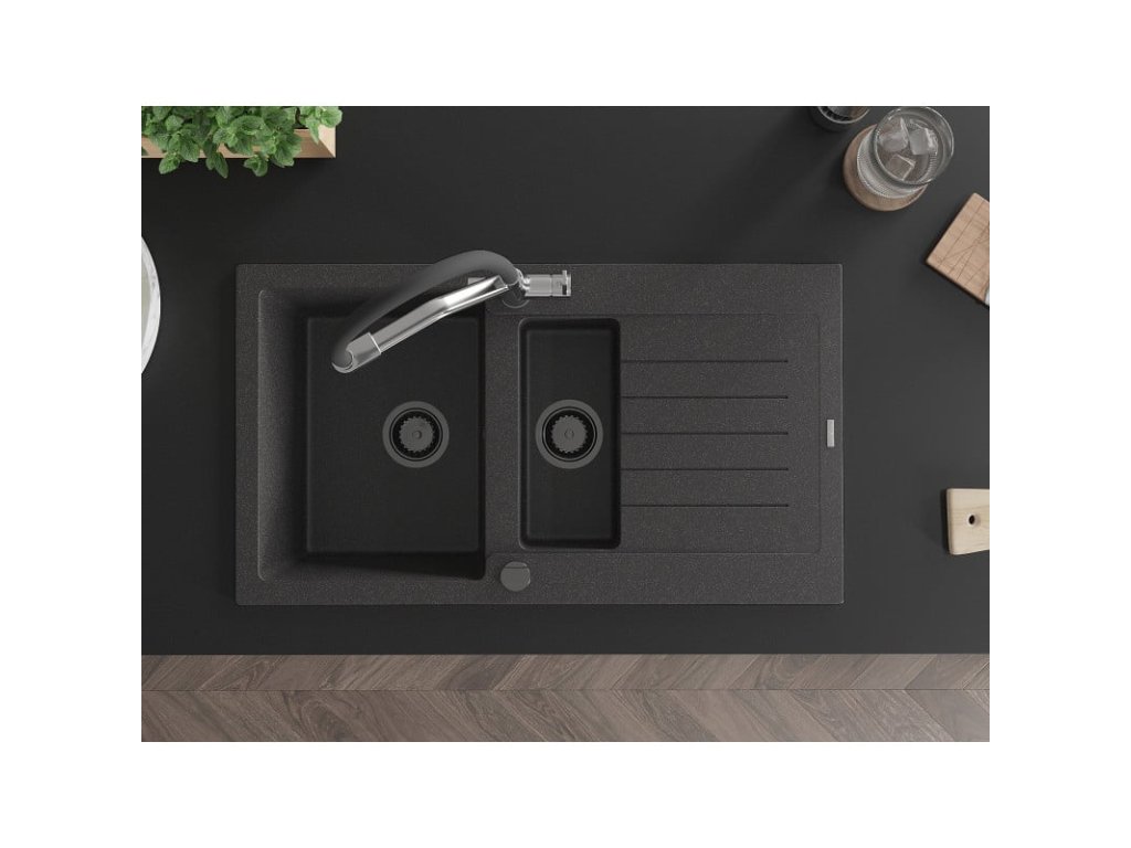 Granitový drez Mexen Matias s 1,5 misy, odkapávačom a kuchynskou batériou Duo, čierny bodkovaný - 6502-76-671701-07-B