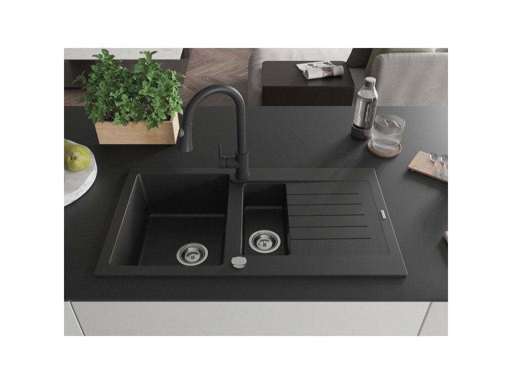 Granitový drez Mexen Matias s 1,5 misy, odkapávačom a kuchynskou batériou Elia, čierny - 6502-77-670101-70