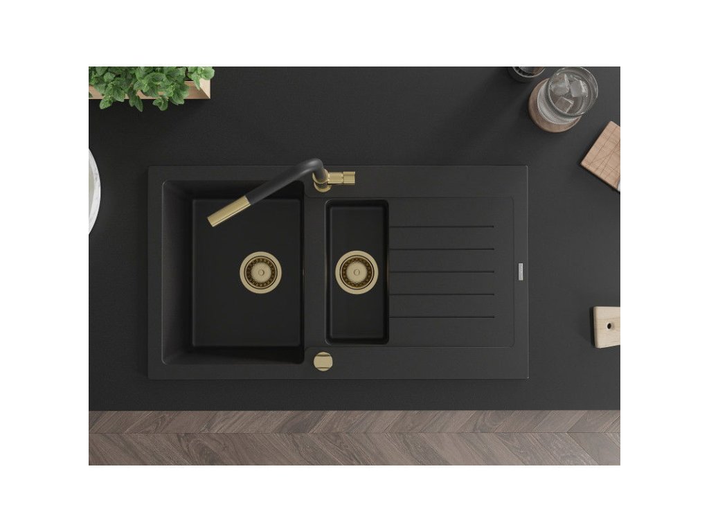 Granitový drez Mexen Matias s 1,5 misy, odkapávačom a kuchynskou batériou Flora, čierny - 6502-77-670401-57-G