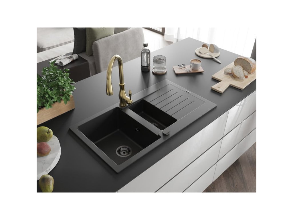 Granitový drez Mexen Matias s 1,5 misy, odkapávačom a kuchynskou batériou Savita, čierny - 6502-77-672601-50-B