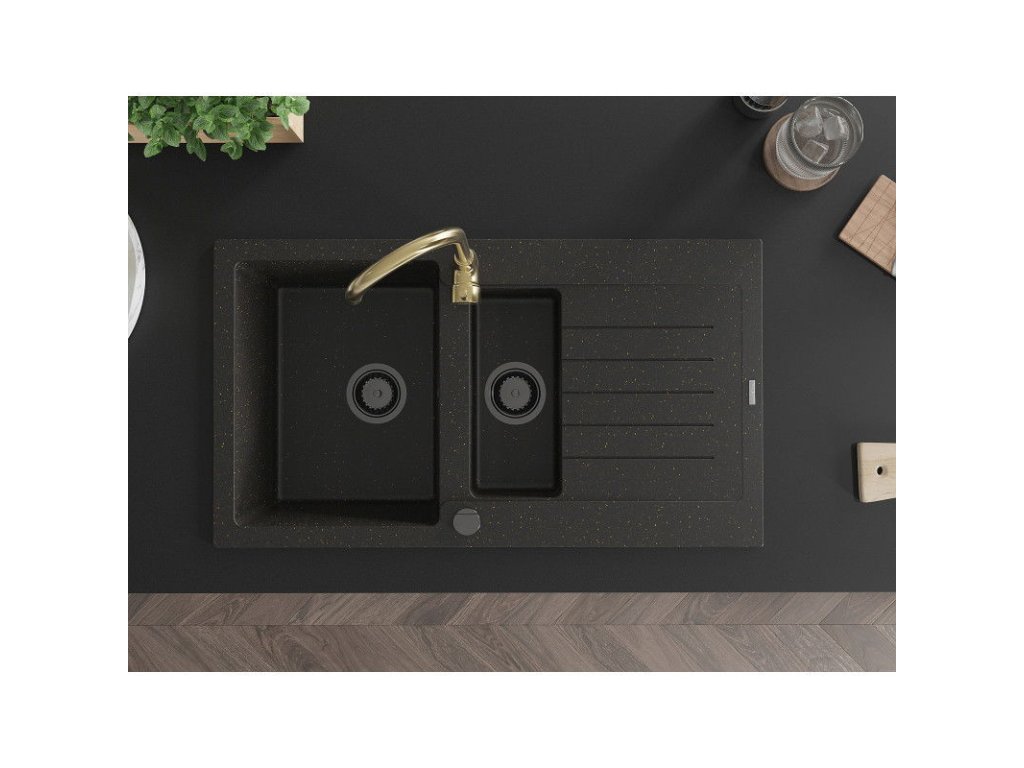 Granitový drez Mexen Matias s 1,5 misy, odkapávačom a kuchynskou batériou Telma, čierna/zlatá - 6502-75-670200-50-B