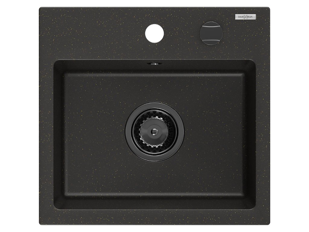 Granitový drez Mexen Milo s 1 misou 435 x 410 mm, čierna/zlatá metalíza, čierny sifón - 6505441000-75-B