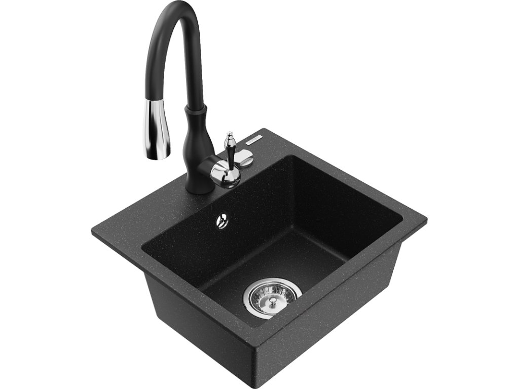 Granitový drez Mexen Milo s 1 misou a batériou Savita, čierna/strieborná metalíza - 6505-73-672601-70