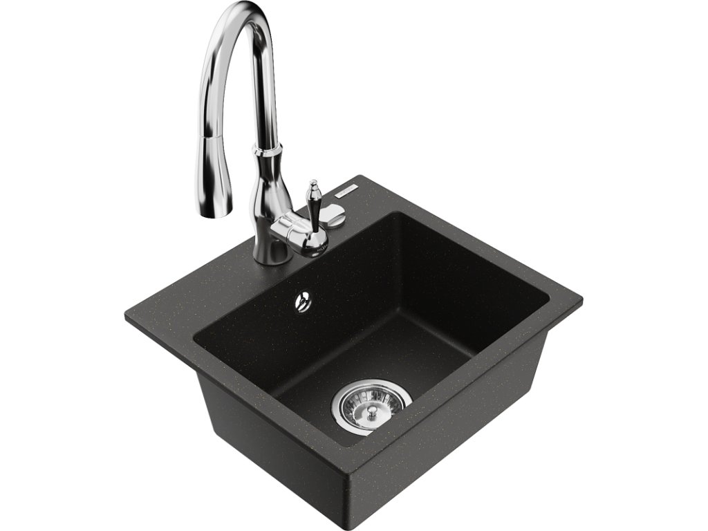 Granitový drez Mexen Milo s 1 misou a batériou Savita, čierna/zlatá metalíza - 6505-75-672601-00