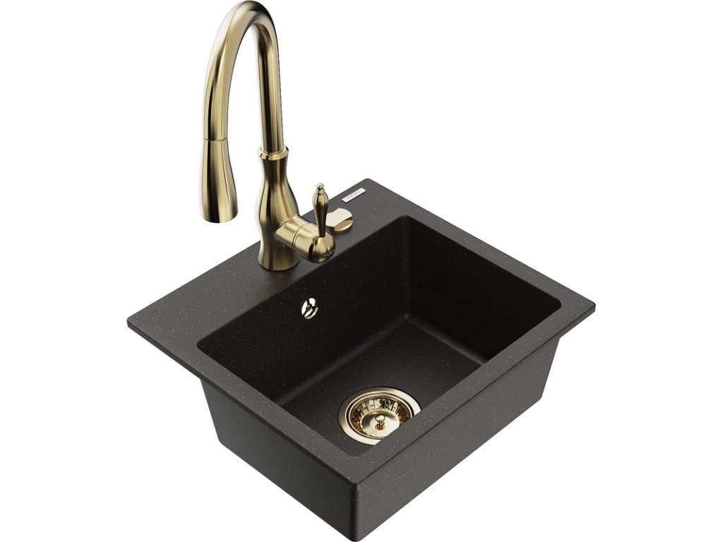 Granitový drez Mexen Milo s 1 misou a batériou Savita, čierna/zlatá metalíza - 6505-75-672601-50