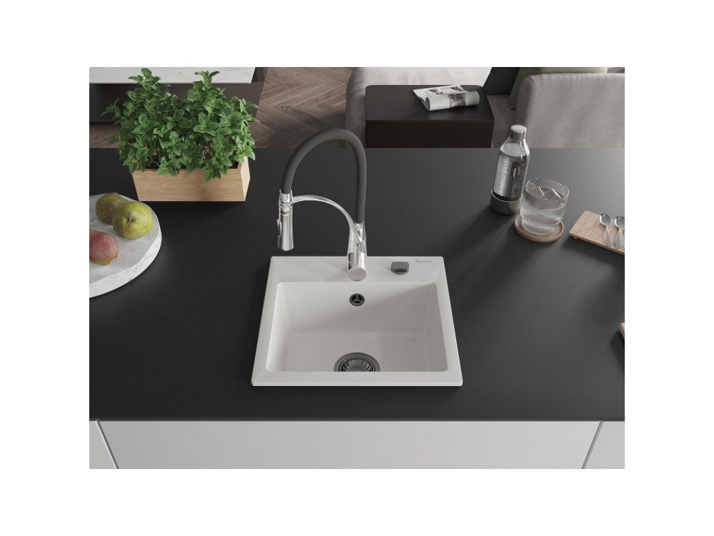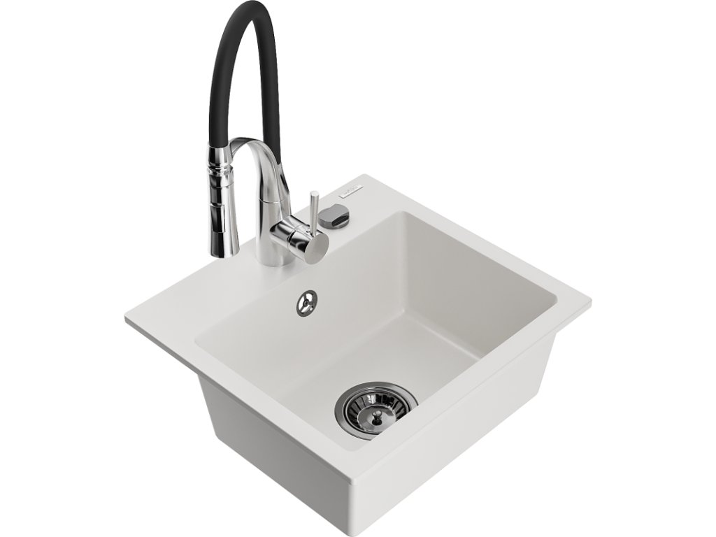 Granitový drez Mexen Milo s 1 misou a kuchynskou batériou Aster, biely - 6505-20-73450-07-B