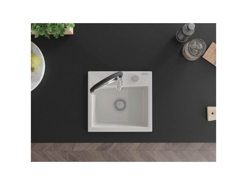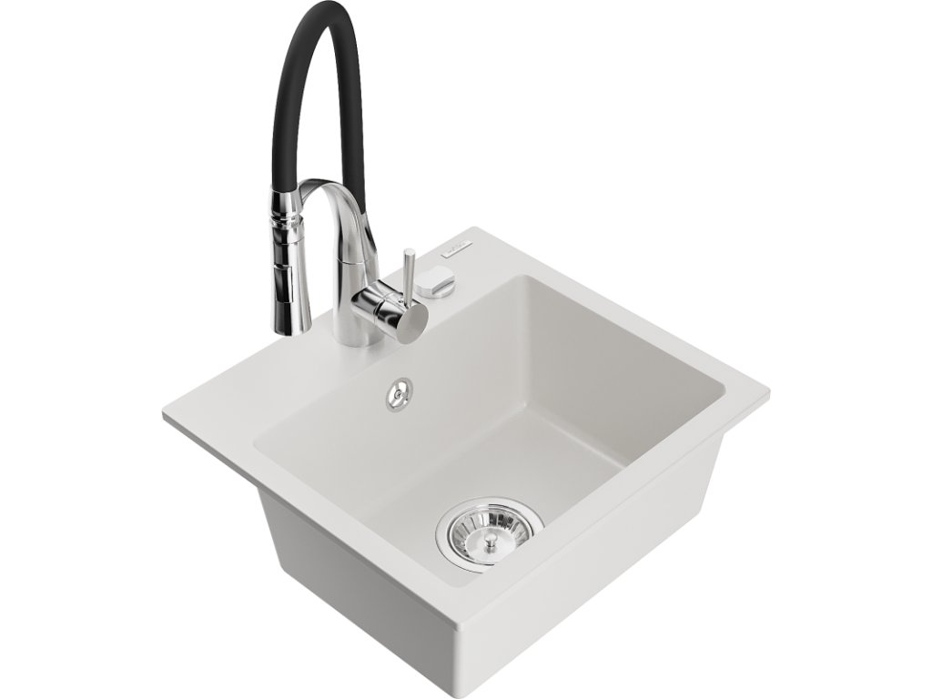 Granitový drez Mexen Milo s 1 misou a kuchynskou batériou Aster, biely - 6505-20-73450-07
