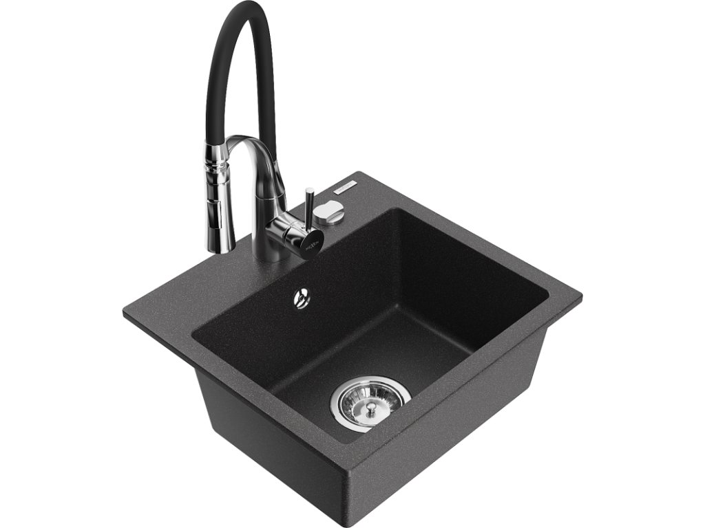 Granitový drez Mexen Milo s 1 misou a kuchynskou batériou Aster, čierna škvrnitá - 6505-76-73450-07