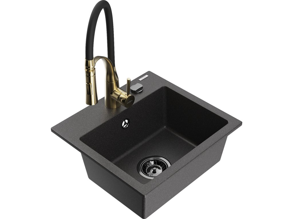 Granitový drez Mexen Milo s 1 misou a kuchynskou batériou Aster, čierna škvrnitá - 6505-76-73450-57-B