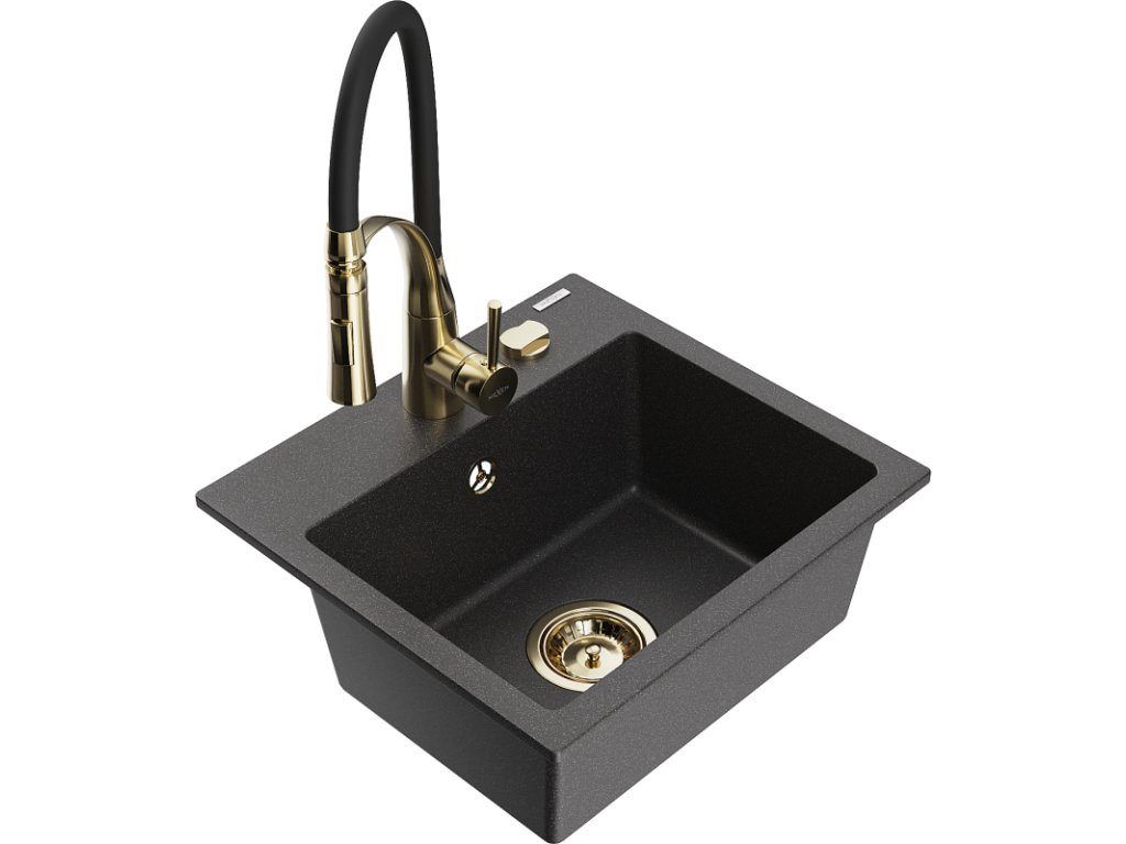 Granitový drez Mexen Milo s 1 misou a kuchynskou batériou Aster, čierna škvrnitá - 6505-76-73450-57-G
