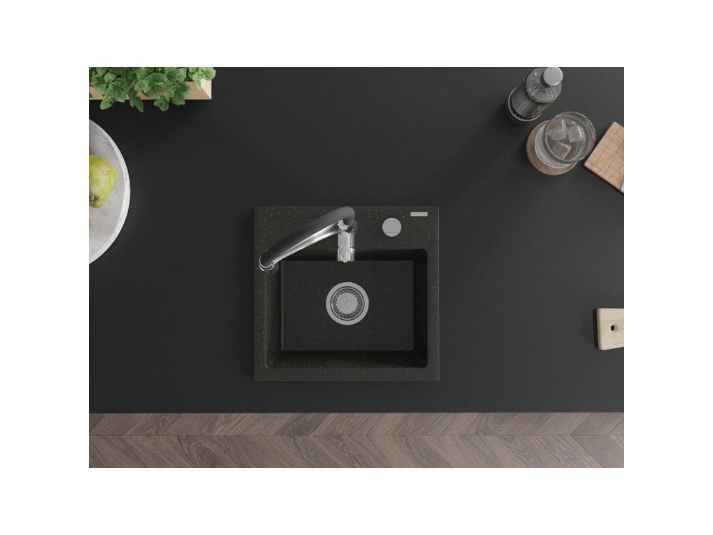 Granitový drez Mexen Milo s 1 misou a kuchynskou batériou Aster, čierna/zlatá metalíza - 6505-75-73450-07
