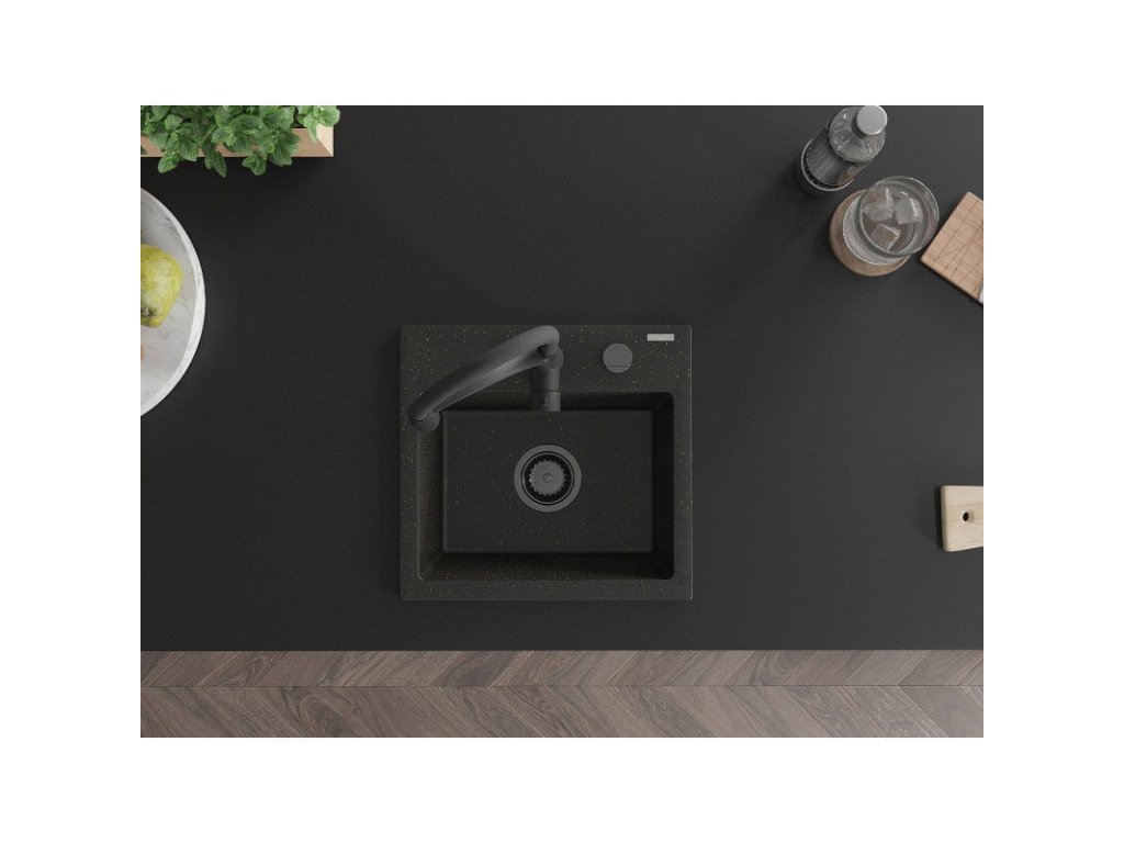 Granitový drez Mexen Milo s 1 misou a kuchynskou batériou Aster, čierna/zlatá metalíza - 6505-75-73450-70-B