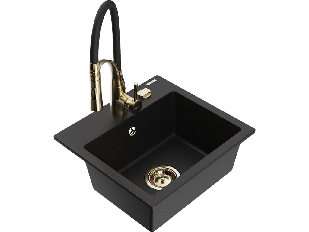 Granitový drez Mexen Milo s 1 misou a kuchynskou batériou Aster, čierny - 6505-77-73450-57-G