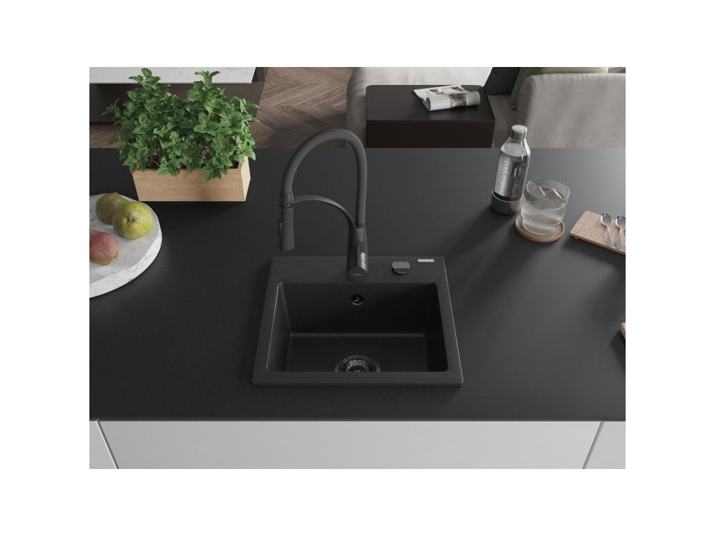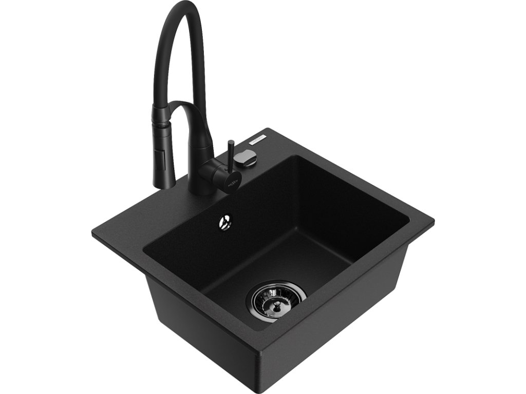 Granitový drez Mexen Milo s 1 misou a kuchynskou batériou Aster, čierny - 6505-77-73450-70-B