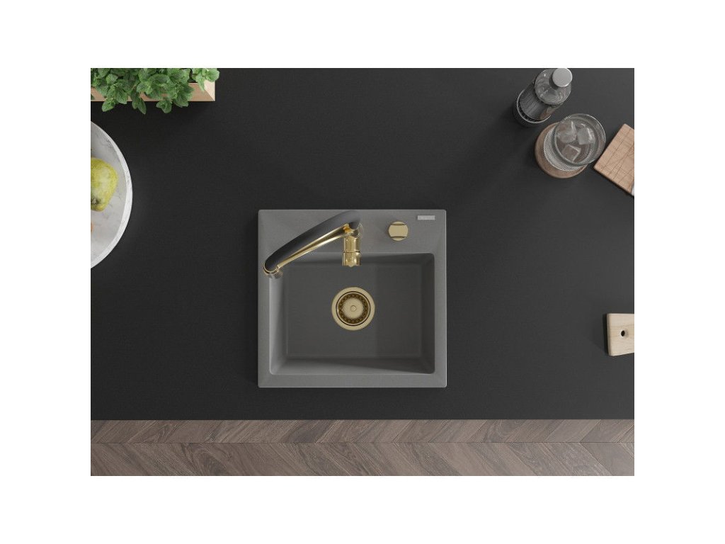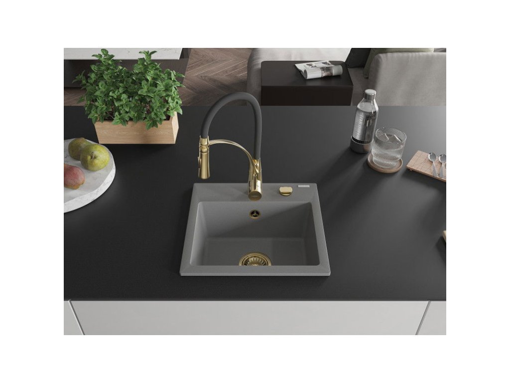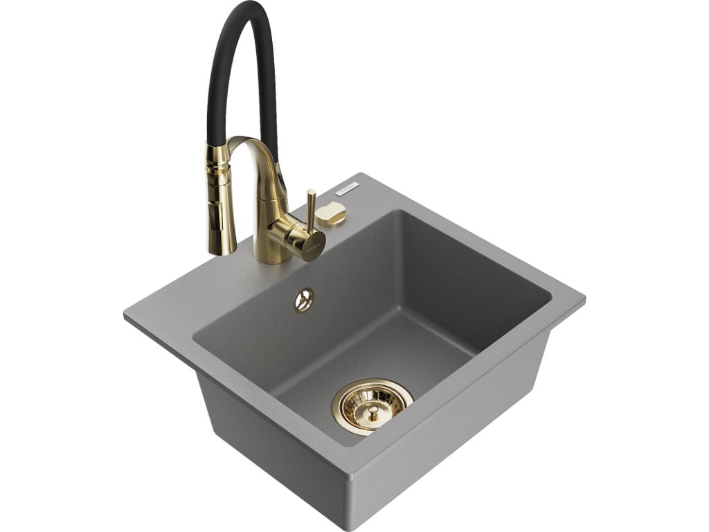 Granitový drez Mexen Milo s 1 misou a kuchynskou batériou Aster, sivý - 6505-71-73450-57-G