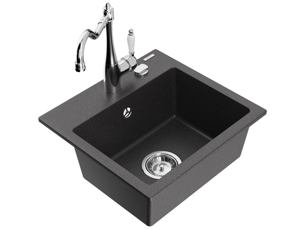 Granitový drez Mexen Milo s 1 misou a kuchynskou batériou Carla, čierna škvrnitá - 6505-76-670700-00