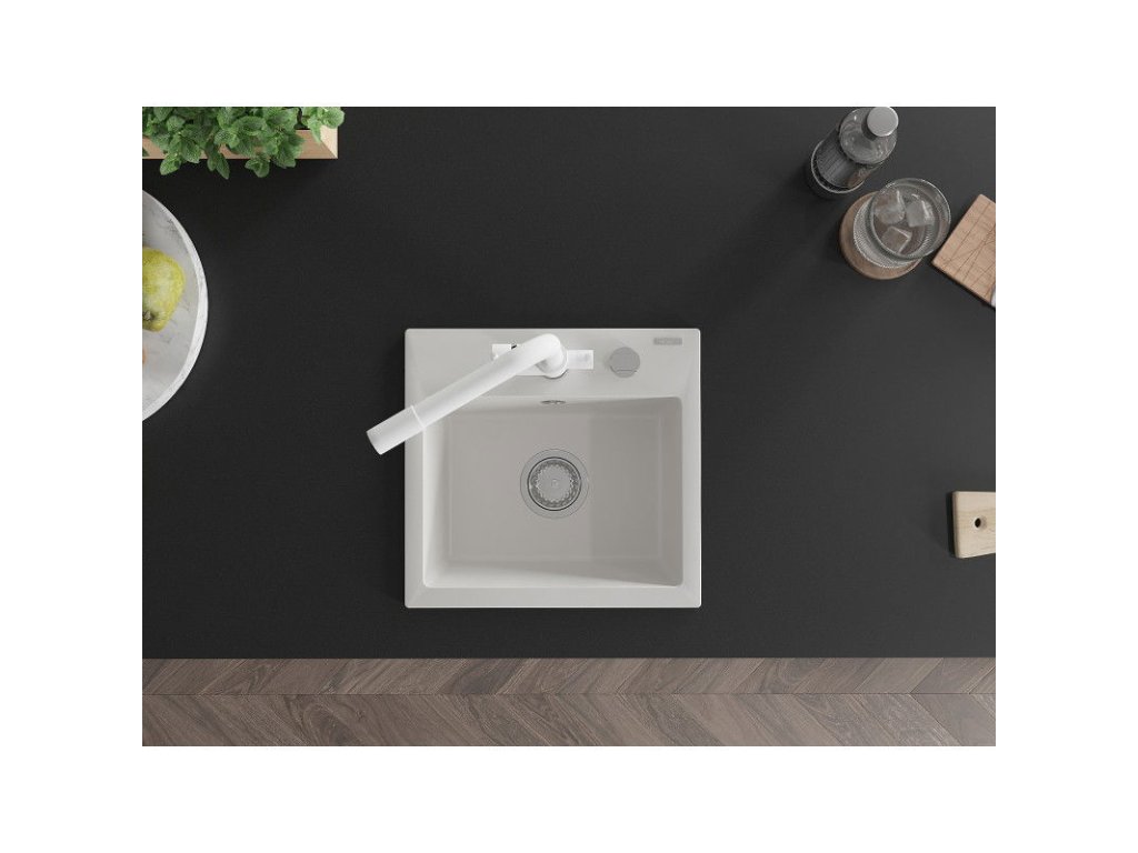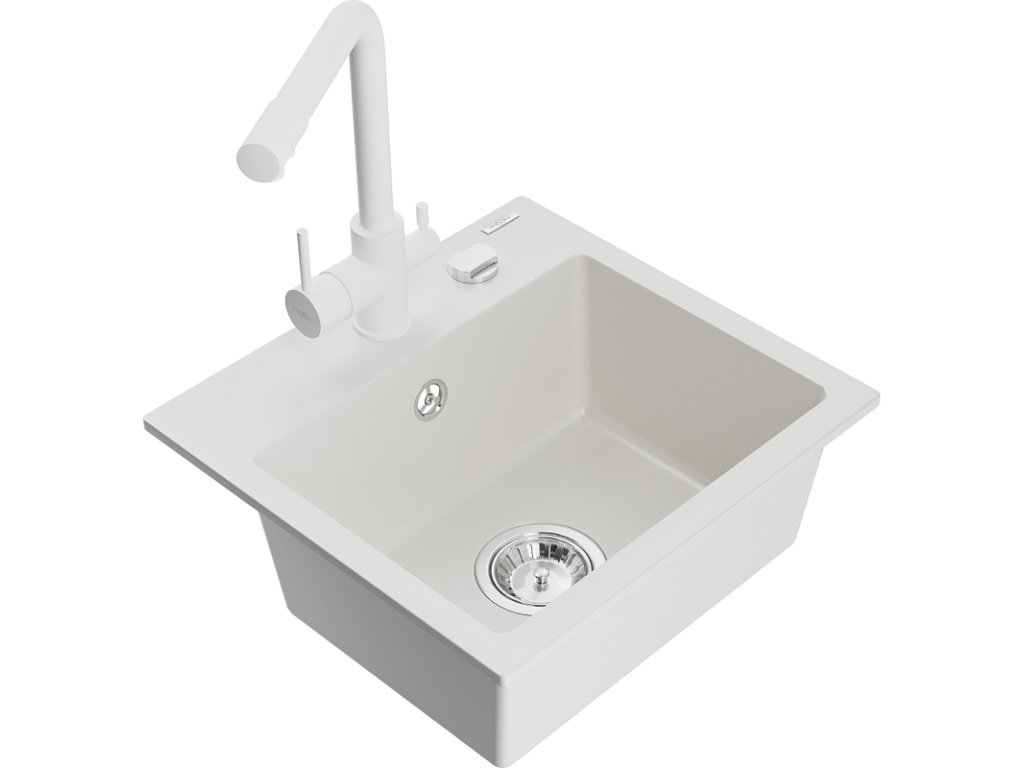 Granitový drez Mexen Milo s 1 misou a kuchynskou batériou Duero, biely - 6505-20-671600-20